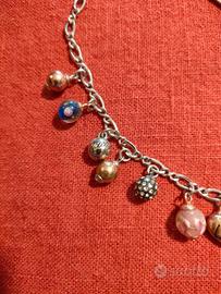 Collana girocollo con charms a forma di sfera, alcune sono murrine altre in acciaio e una con strass, cuore centrale bombato con logo. Usata ma in ottimo stato con sacchetto originale. Lunghezza da 40 a 45 cm.