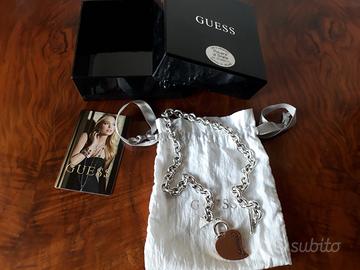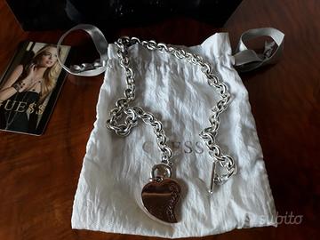 Vendo collana da donna a maglie Guess Fahion con cuore 316L (codice UBN80948), in ottimo stato in quanto usata pochissime volte. La collana, lunga 43 cm, è in acciaio rodiato nichel free color argento, con ciondolo a forma di cuore in ottone con logo inciso e piccolo charm triangolare con logo Guess inciso, chiusura T-bar. Fornisco anche confezione originale come da foto. Consegna a mano Mortara e limitrofi o Milano. Possibile spedizione con costi a carico dell'acquirente