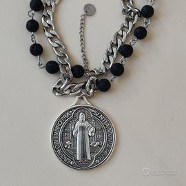 Halfsy Punk Chain, metà realizzata in acciaio inossidabile lavorato a rosario con sfere in onice nera opache, maxi medaglia devozionale portafortuna San Benedetto double face con croce, in zama, cm 4,2 cm. Metà montata su una robusta catena cubana in acciaio inossidabile con chiusura regolabile ed estensione di 5 cm.
