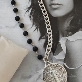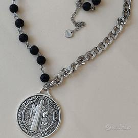 Trendy e d’impatto, questo pezzo unisce un’estetica punk di una catena audace per completare il tuo look, e il portafortuna popolare italiano, rappresentato dalle medaglia di protezione di San Benedetto, e dalla forza dell’onice nero.