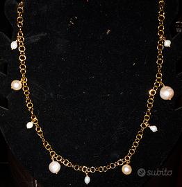 Collana Handmade con catenina dorata nichel free e perline bianche pendenti e perle di fiume, facili da abbinare
