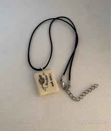 Collana regolabile con ciondolo bianco fatto a mano in porcellana fredda con elementi di arte lineare e botanica. I love you ( ti amo )