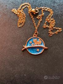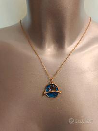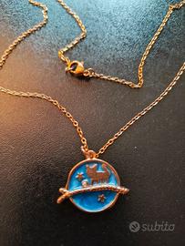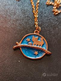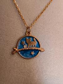 Catenina in acciaio dorato con gattino sul ramo e punto luce brillante. Catenina in acciaio dorato con pendente rotondo con sfondo smaltato blu: decorazione dorata in rilievo di gatto 🐱 su un ramo, con stelline e punto luce dato da un piccolo brillantino. Lunghezza totale cm 24. Chiusura con piccolo moschettone dorato. Nuova. Mai indossata.