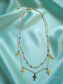 bellissima collana in acciaio inossidabile, ciondoli croce. nuova con la scatola . colore oro