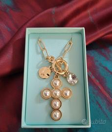 bellissima collana in acciaio inox ciondolo croce. colore oro. nuova con la scatola