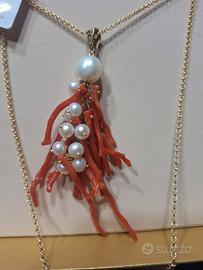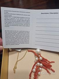 Collana in argento bagnato oro con ciondolo di perle coltivate e rami di corallo del mar Egeo. In confezione originale come da foto con cartellino timbro gioielleria e descrizione articolo