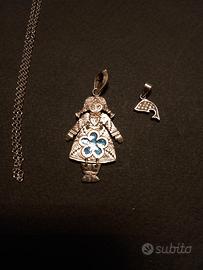 collana lunga 46 cm con ciondolo originale a forma di bambina snodabile con trecce e fiore blu+ ciondolo delfino