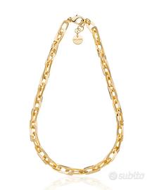 Collana Unoaerre a catena quadra concatenata in bronzo dorato, chiusura a moschettone e targhetta con logo. Misura 43,00 cm. + 2. Unoaerre rivisita il grande classico della catena forzatina in una nuova audace declinazione a maglia concatenata per un susseguirsi unico di stile. Prodotto made in Italy completo di confezione e certificato Unoaerre.