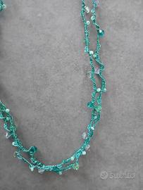 Collana fatta a mano in pizzo chiacchierino. Filo Gioiello Scintilla Fine colore Acqua, perline rosa in vetro Frizzy e sulle tonalità del verde. Lunghezza totale con le estensioni 57cm. #handmade #chiacchierino