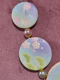 Questa collana artigianale è un omaggio alla raffinata tradizione giapponese, combinando l'eleganza del tessuto chirimen con l'arte del decoupage su carta da origami. Il colore predominante, murasaki, rappresenta il viola, una tonalità storicamente legata alla nobiltà e alla spiritualità in Giappone.