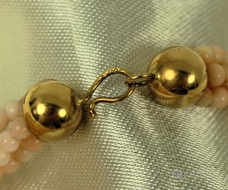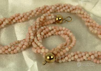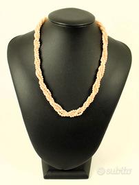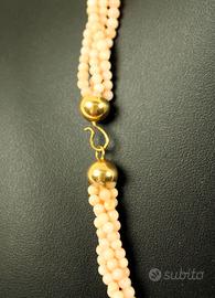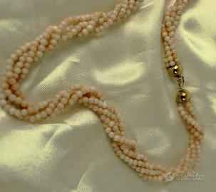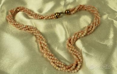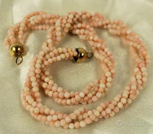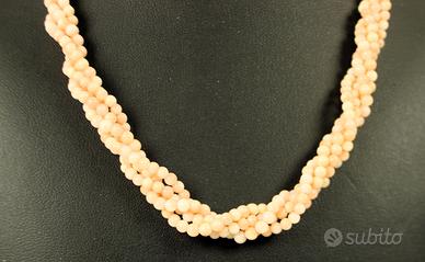 Originale collana di perline di corallo rosa naturale ritorto, a 4 fili.