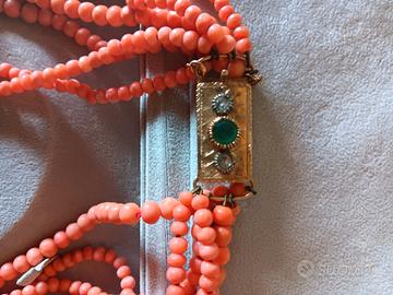 collana in corallo rosa di sciacca antica, con annesso medaglione in corallo rosa e oro peso corallo gr,128,78--- peso medaglione gr.36,10 presenti uno smeraldo, 3 diamanti- un regalo di prestigio per una donna a cui tenete molto completa di certificato di garanzia, scatola e autenticita'