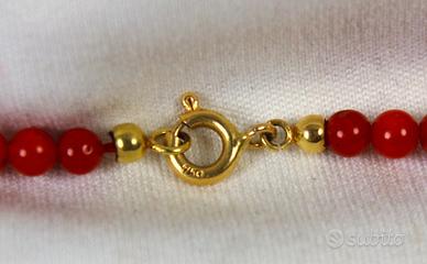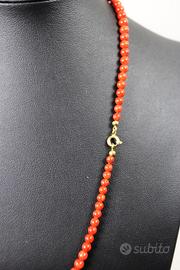 Preziosa collana in perle di corallo rosso sardo naturale con sfere decrescenti e gancio in oro 750.