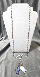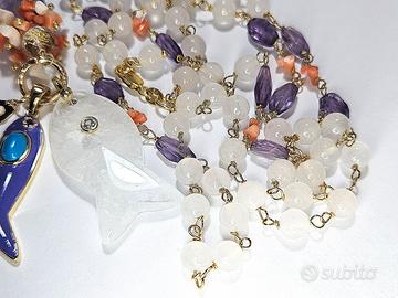 Lunga collana sautoir in gold filled 18 kt e pietre naturali: ametista, corallo rosa e giada milky. Con pesciolini Capri style. Due pesciolini sono in metallo placcato a caldo in oro, con smalti e pietre dure. Il più grande è in giada milky e swarovsky. Misura girocollo: 96 cm. Il pendente è lungo c.a. 10 cm. La collana è nuova, mai indossata. La chiusura è a moschettone. Non si effettuano consegne a mano.
