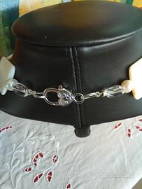 collana girocollo in madreperla bianca con fiore centrale e piastre rettangolari. inserite vere perle d' ostrica di acqua dolce e pietre naturali di cristallo di rocca.