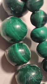 Collana in malachite naturale, lunghezza cm 60, con perle scalari da 6 a 12 mm circa, pietre con ottima lucentezza con le tipiche venature concentriche verdi. Chiusura argentat perfettamente funzionante