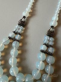 Collana in Opale Originale Anni 60. Mai utilizzata. Perfettamente conservata, in condizioni impeccabili. Imn opalite, detta anche "pietra di luna", caratterizzata da un aspetto lattiginoso e una lucentezza iridescente. La collana è a doppio filo nella parte centrale inferiore, unita da distanziatori metallici lavorati di colore argento, e si assottiglia in un unico filo di perline più piccole verso la chiusura. L'estetica è versatile, adattandosi a stili che vanno dal vintage al boho chic, fino a richiamare l'oggettistica da preghiera come i tasbih. Si tratta di un gioiello elegante e senza tempo, spesso associato a occasioni speciali o come regalo significativo. Preziosa ed elegante. Bella da possedere, da indossare, ma anche, da regalare. Un pezzo unico.