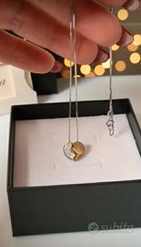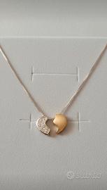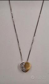 Questo Collier celebra I'unione e l'eleganza con un design dal forte significato emotivo. Il pendente è composto da due mezzi cuori che si fondono armoniosamente. Realizzati in prezioso Oro Giallo 18 kt. Una metà del cuore è interamente impreziosita da 11 Diamanti naturali per un totale di 0.12 ct. che catturano magnificamente la luce ad ogni movimento, creando un punto luce sofisticato . Materiale: Oro Giallo& Bianco 18kt 11 Diamanti naturali (totale 0.12 ct. Peso 2.54 g Lunghezza catenina 42 cm Sarà spedito completo di: Confezione e Garanzia Pronto per essere regalato ad una persona speciale