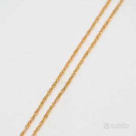 Collana in oro giallo 18 kt grammi 1,9 . Il ciondolo ha la forma di un rombo con una lavorazione satinata e lucida. Il lato misura cm. 1,1 e la maglia della collana è una singapore lunga cm. 44,5. Prodotto made in Italy munito di marchio di fabbrica come da legge e completo di confezione e certificato di qualità rilasciato dalla Gioielleria.