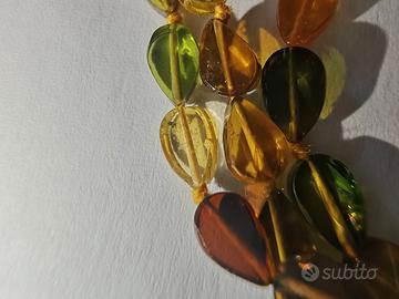 Collana in Oro Giallo 18kt (750) con Ambra Baltica Multicolore a Goccia Materiale: Oro giallo 18 carati (punzone 750 presente sulla chiusura). Pietre: Ambra Baltica naturale al 100%. Taglio: Gocce sfaccettate (Briolette). Colori: Multicolore (Cognac, Miele, Ciliegia). Peso: 12 grammi Lunghezza totale: circa 44-45 cm. Condizioni: Ottime