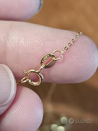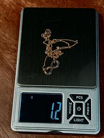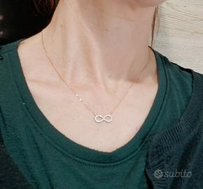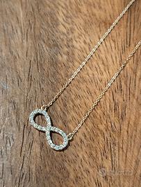 Collana in oro giallo 9kt con simbolo dell'infinito Punto luce Oro giallo 9kt punzone visibile in foto 375 Peso 1,2 grammi Misure 20cm Brillantini zirconi trasparenti molto luminoso ed elegante Posso inviare altre foto su richiesta