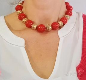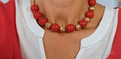 Collana girocollo vintage a perle grandi di colore rosso corallo intervallate da inserti dorati con lavorazione a sbalzo. La collana é vintage ma in buone condizioni perché usata pochissimo