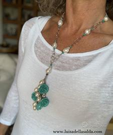 Vendo collana "Luisa della Salda" (alta bigiotteria) in perle barocche alternate a catena e turchesi, con un grappolo centrale di rose di resina e ciondoli in argento rodiato.