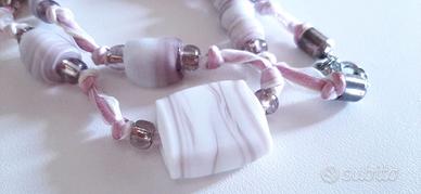Bellissima collana in perline venate dai toni rosa lilla pastello, di varie dimensioni, su cordoncino annodato. Chiusura con gancetto in metallo.