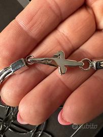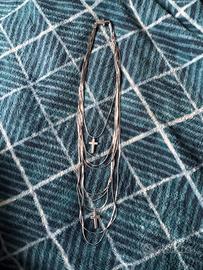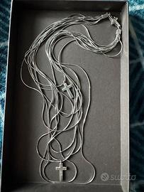 La collana mostrata nell'immagine è un modello multifilo firmato Cesare Paciotti, caratterizzato da una struttura a più catene sottili in argento o acciaio con pendenti a forma di croce. Questo stile è tipico sia delle collezioni principali del brand che della linea 4US Cesare Paciotti. Sebbene il modello esatto con due croci su più fili possa variare a seconda della collezione (come la serie Steel o Incision), esistono diverse opzioni simili disponibili: Modelli Multifilo: Molte collane del brand utilizzano una maglia multifilo in acciaio 316L, spesso con lunghezze regolabili tra i 45 e i 55 cm. Dettagli Croce: I pendenti possono presentare diverse finiture, da quella satinata a quella lucida, talvolta impreziositi da zirconi bianchi o neri. Materiali: Le collezioni spaziano dall'acciaio inossidabile anallergico all'argento 925