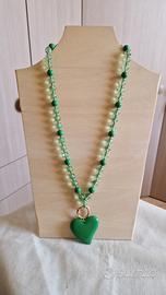Collana artigianale in resina verde con ciondolo a cuore. Lunghezza 40+40 cm Leggera all'indosso Sacchetto in organza