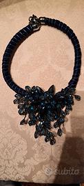 Collana artigianale girogola in tessuto e pietre a cascata blu notte. Inserzione centrale di stella in cristalli sempre blu notte.