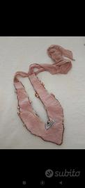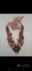 collana in tessuto da legare con fiocco in voille. decorata con perline. pietre anelli e voille di colore rosa e beige