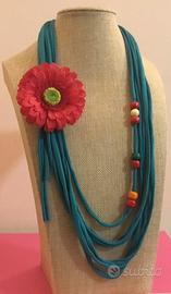 Collana realizzata in tessuto-fettuccia di cotone e lycra verde, arricchita da un grande fiore rosso e da perline colorate. - Fiore decorativo rosso. - Perline in legno colorate: rosse, gialle, verdi e arancioni. - Design multistrato.