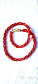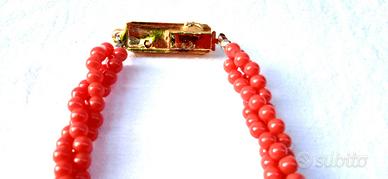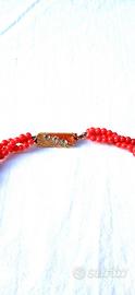 Bella collana torchon a tre fili-vintage- di perline opaline in vetro di conteria color rosso corallo con gancio che si apre a leggera pressione. Il gancio è in metallo color ottone e strass riflettenti. La collana è in eccellenti condizioni, fra l'altro particolarmente lucente, ed ha lunghezza di 26,2 cm. le perline non sono minute, ma comunque abbastanza piccole. Ho fatto valutare l'oggetto dalla Sig.ra Nives Marcassoli, esperta nella lavorazione del vetro, la cui attività è rinvenibile in internet, la quale si è recata presso la mia residenza a vedere di persona le mie collane. Proviene da collezione privata ed è collocabile nella seconda metà del 1900.