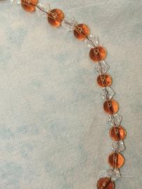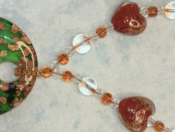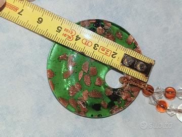 Collana donna con ciondolo rotondo in vetro verde scuro con glitter rame. Pendente grande circa 4 cm di diametro. Catena composta da perle vetro cristallo trasparenti e arancioni. NOTA: Le prime due perle grandi in vetro tondo subito dopo il pendente sono quasi del tutto sbiadite. Chiusura a moschettone. Gioiello moda elegante estivo. Condizioni ottime considerando l'imperfezione menzionata.