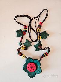 raffinata collana vintage in legno pregiato finemente lavorata con motivi floreali e foglie. allungabile . filo in cuoio sottile.