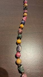 Collana lunga multicolor con perline tonde e elementi irregolari effetto marmorizzato (rosa/verde/viola + giallo). Stile boho/vintage anni 2000, perfetta per look estivi/festival.
