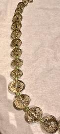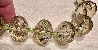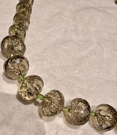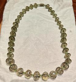 Collana lunga con stere trasparenti color verde chiaro di misure degradanti. Chiusura nascosta sempre medesimo colore, separatori con piccole