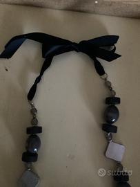 Vendo elegante collana lunga da donna con perle grigio fumo, elementi neri e inserti geometrici color argento satinato.