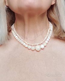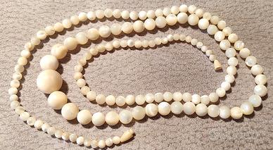 Collana lunga vintage anni '50 in madreperla bianca con perle lisce a gradazione di cui quella più grande centrale diametro 14mm e la più piccola diametro 4mm.