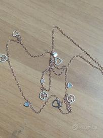 Collana da donna Nomination in argento 925 ipoallergenico con finitura oro rosa 22 kt e con madreperla. Simboli pendenti lungo tutta la collana di cuori misti in madreperla bianca e simbolo albero della vita con cubic zirconia. La collana è lunga 90 cm con chiusura a moschettone.