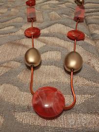 Vendesi bellissima collana lunga dal design contemporaneo e originale. Caratterizzata da un mix di elementi geometrici, è composta da perle sferiche color oro satinato, element rettangolari in resina effetto marmo/ pietra nei toni del rosa e grandi dischi in resina venata arancio bruciato. #collana #bohochic #accessori #jewelry #resina #statementnecklace #vintage Hetnico Hautumnstyle