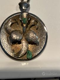 Collana lunga argento 800 con ciondolo spilla con pietra verde( smeraldi grezzi) Potrebbe essere made in Venezuela. Anni 70