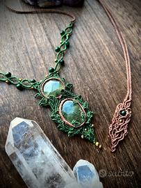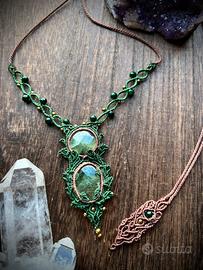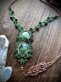 Collana artigianale in macramè realizzata interamente a mano, con doppia prehnite naturale incastonata in un intreccio ispirato a forme vegetali e organiche. La prehnite, con le sue delicate tonalità verde chiaro e la naturale trasparenza, presenta inclusioni uniche che rendono ogni pietra irripetibile. Le gemme sono montate in cabochon e valorizzate da un lavoro tessile dettagliato, arricchito da piccole perle decorative che donano profondità e armonia al design. Il cordino, nei toni del verde e della terra, richiama un’estetica naturale ed equilibrata, rendendo la collana un pezzo elegante ma al tempo stesso profondamente connesso alla natura.