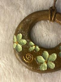Vendo collana color marrone con fiori verdi e dettagli in oro, realizzata in argilla (realizzabile anche in altri colori). Il ciondolo è alto 3mm, la lunghezza del filo è regolabile