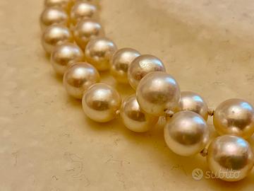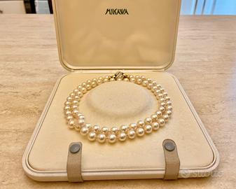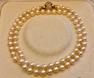 Collana di Mikawa con perle giapponesi akoya di acqua salata. Dimensione della perla 8,5 mm. Fermezza in oro 750 con 28 brillanti (14 per ciascun lato). Lunghezza 78 cm. Peso complessivo 81 gr. Peso fermezza 12 grammi.