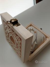 Vendo collana donna Miluna Collezione "L'argento di Miss Italia" art. PCL5627 Collana a tre fili in argento 925 con 17 perle coltivate color bianco, grigio e rosa, diametri vari da 5,5-7 mm Lunghezza collana 42 cm fino a 44 cm grazie all’uso degli anellini di allungo presenti nell’estremità vicino alla chiusura. NUOVA, mai indossata. SENZA cofanetto originale (smaltito per errore). La custodia compresa (visibile in foto 6) è un artefatto in legno artigianale.