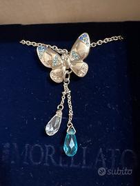 Questa collana con pendente a forma di farfalla fa parte della collezione Volare di Morellato. Il modello specifico mostrato nell'immagine è il SOX08. Design: Un ciondolo a farfalla con ali impreziosite da cristalli bianchi, azzurri e blu. Elementi pendenti: Due gocce di cristallo, una trasparente e una azzurra, che scendono dal corpo centrale. Materiali: Realizzata in acciaio anallergico con un diamantino naturale incastonato al centro della farfalla. Lunghezza: La catena a maglia rolò misura circa 43 cm, regolabile a 40 cm.