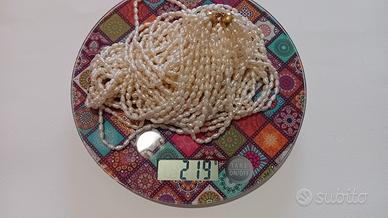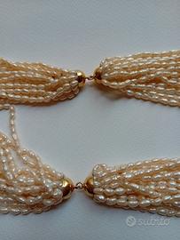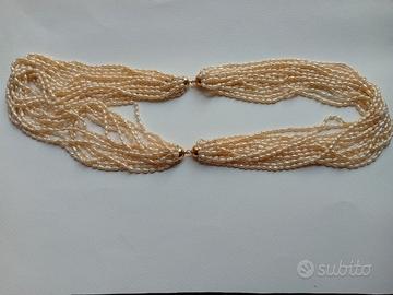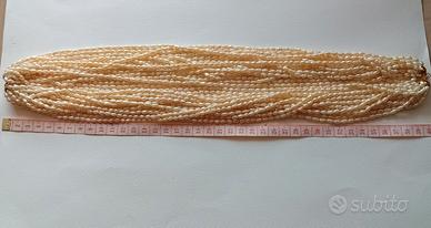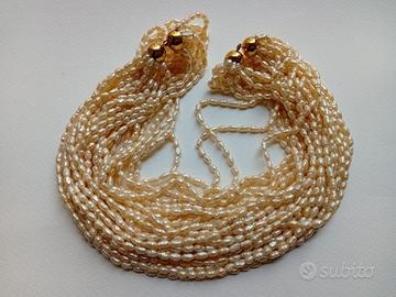 Collana lunga 80cm realizzata con 30 fili di perle di fiume cosiddetti "chicchi di riso" lunghi 40cm. I raccogli filo sono in metallo color oro. Nessuna susta in quanto può essere indossata agevolmente vista la lunghezza.