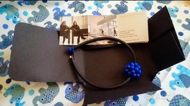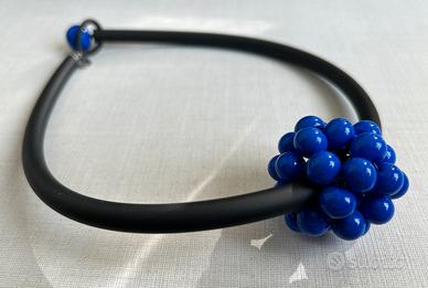 Collana Mora in vetro di Murano e gomma, realizzata dalle sorelle Marina e Susanna Sent, che disegnano e producono a mano gioielli originali e di eccezionale bellezza. Le perle sono realizzate con la tecnica del vetro a lume, il girocollo in gomma permette di essere indossato anche da chi soffre di allergie ai metalli. Lunghezza cm 48 circa, mora 4x4 cm. Il ritiro é a carico dell’acquirente a Milano vicino M4 fermata San Cristoforo